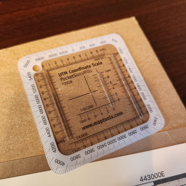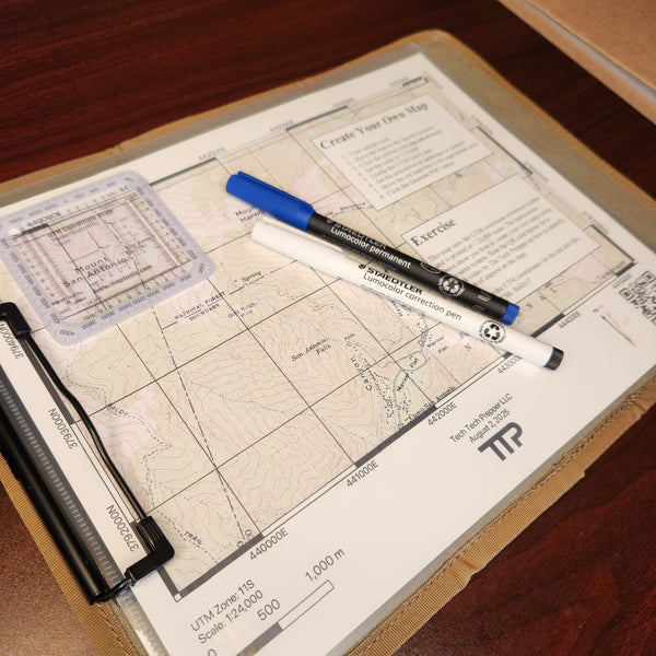 The TTP Land Nav Kit is a tri-fold navigation kit designed for use with the UTM (Universal Transverse Mercator) grid coordinate system.